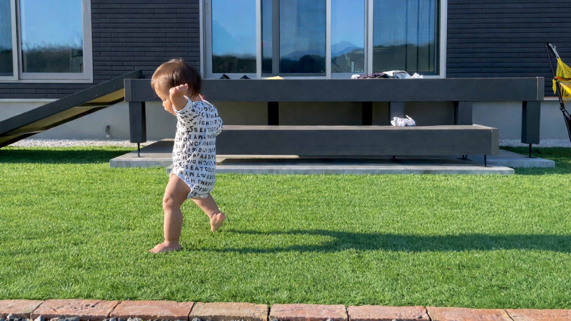 人工芝は、見た目だけでは違いが分かりません。ターフメイトは、踏み心地に差が出る「中身」にこだわり、ふかっとした心地よさと安心感をつくっています。